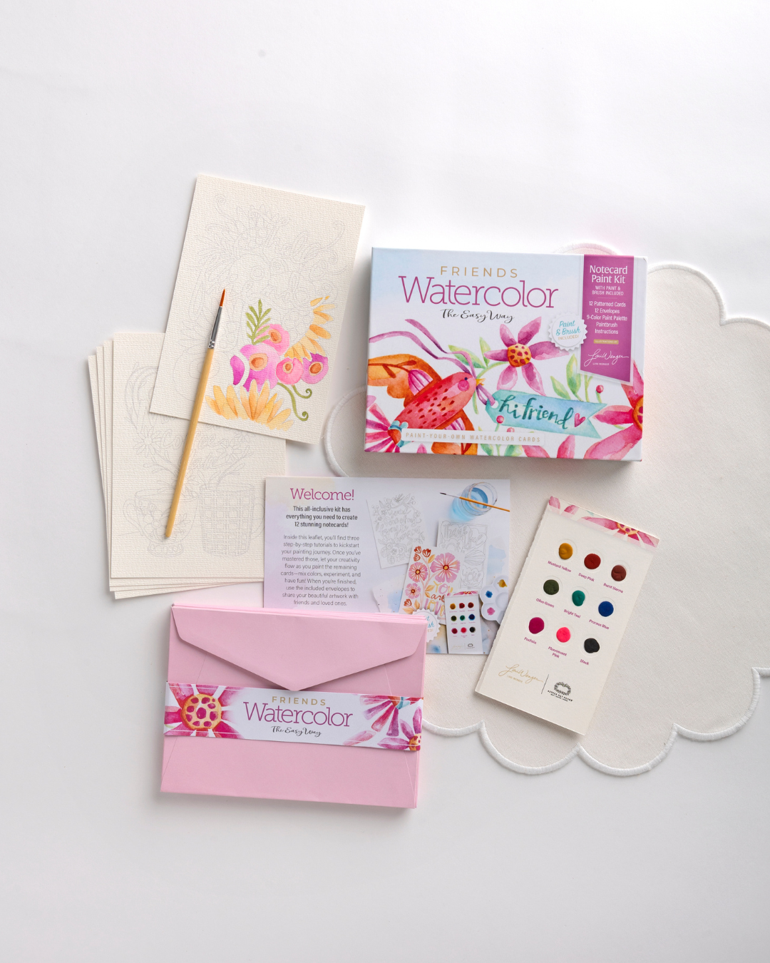 Relax and unwind as you experience the joy of watercolor painting with this deluxe kit that includes everything you need to get started—even the paint itself! This beautiful lidded box features 12 illustrated Friends designs by watercolor artist Lori Wenger. Printed on thick watercolor paper, the notecards highlight heartfelt themes and uplifting messages to remind any special recipient that they are loved. With floral motifs and warm sentiments throughout, each card is designed share creativity and brighten the day.