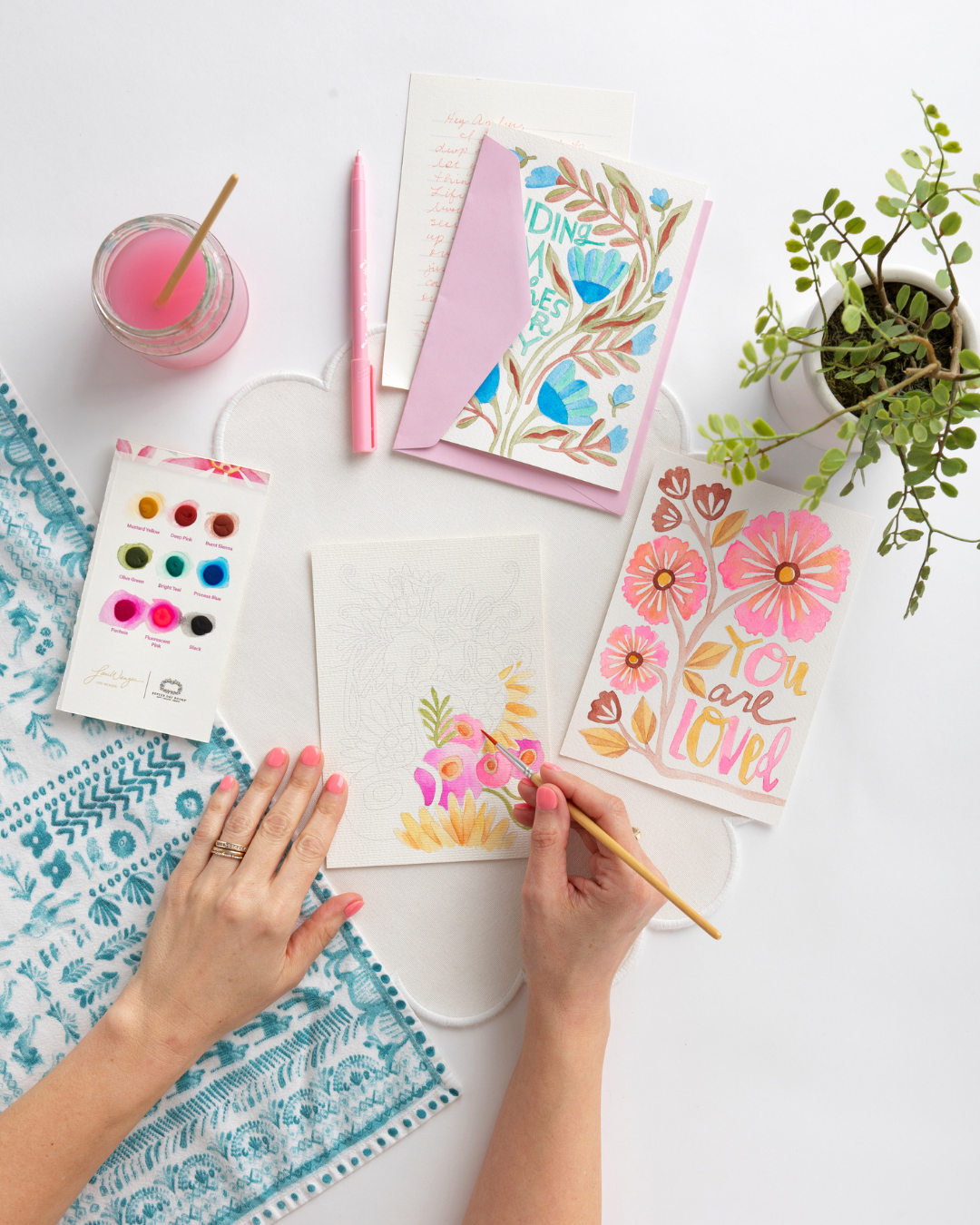 Also included in the box are 12 coordinating envelopes, an easy-to-use 9-color watercolor paint palette, a swatch card, a paintbrush, and simple instructions. The high-quality palette contains all the colors you’ll need to paint the designs, mix your own custom shades, and let your creativity flow. You’re sure to love this all-in-one set that truly makes watercoloring a breeze!